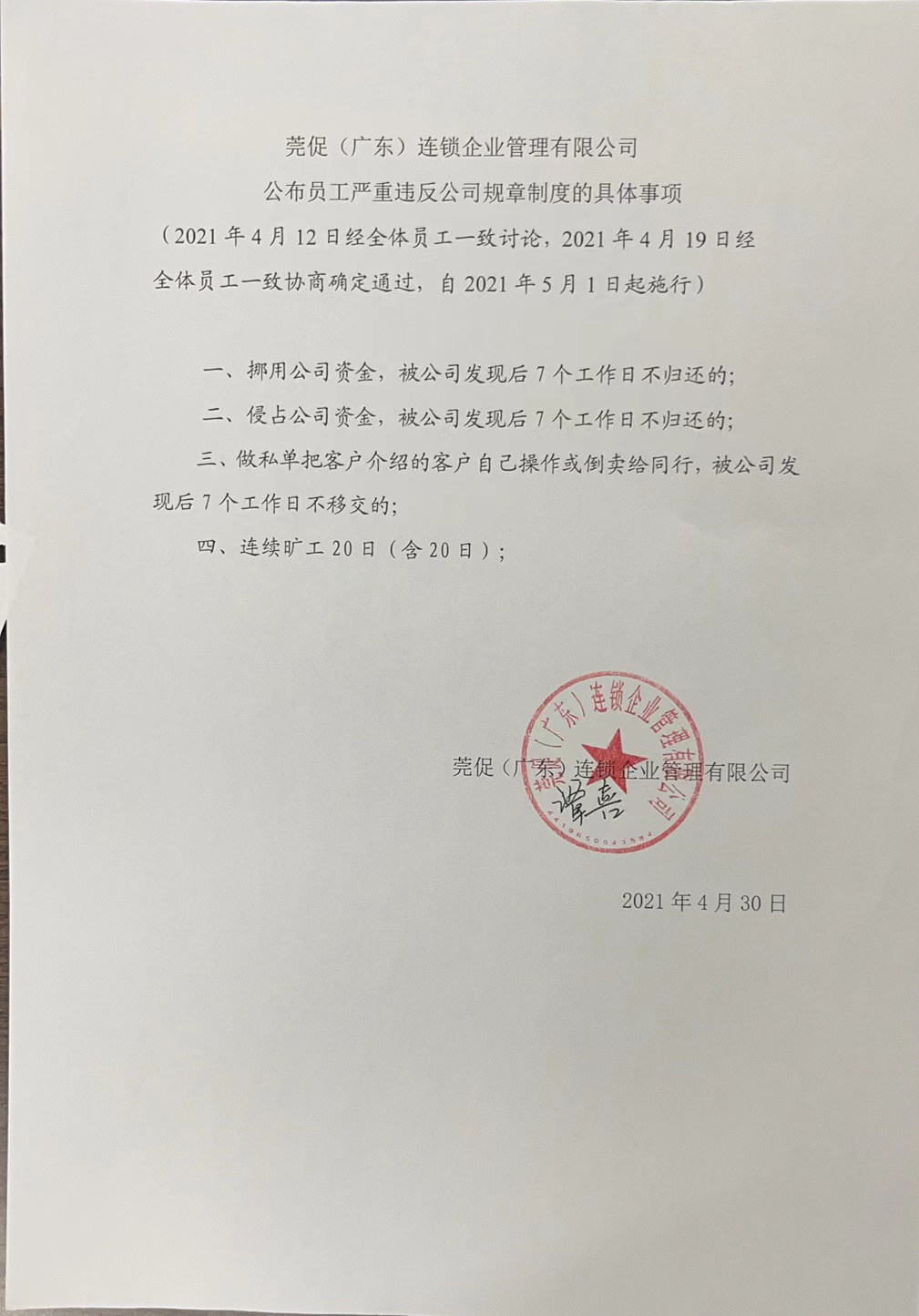 莞促连锁关于公布员工严重违反公司规章制度具体事项的通知